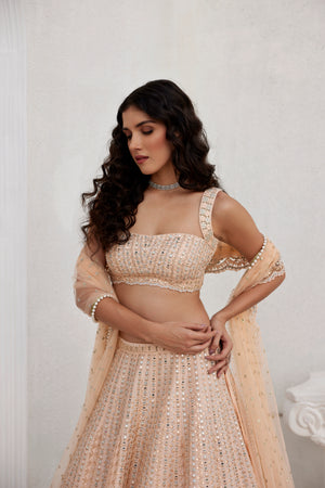 Dusty Peach Mirror And Leather Applique Skirt On Dupion Silk Paired With Embroidered Top And Tulle Dupatta