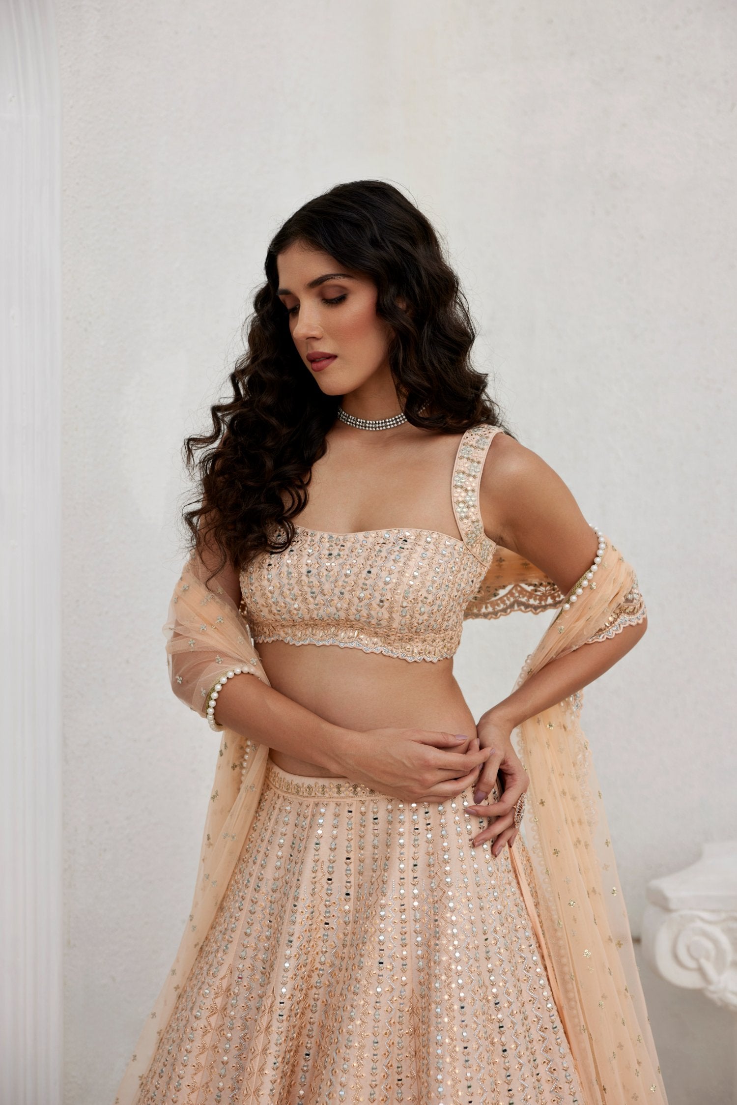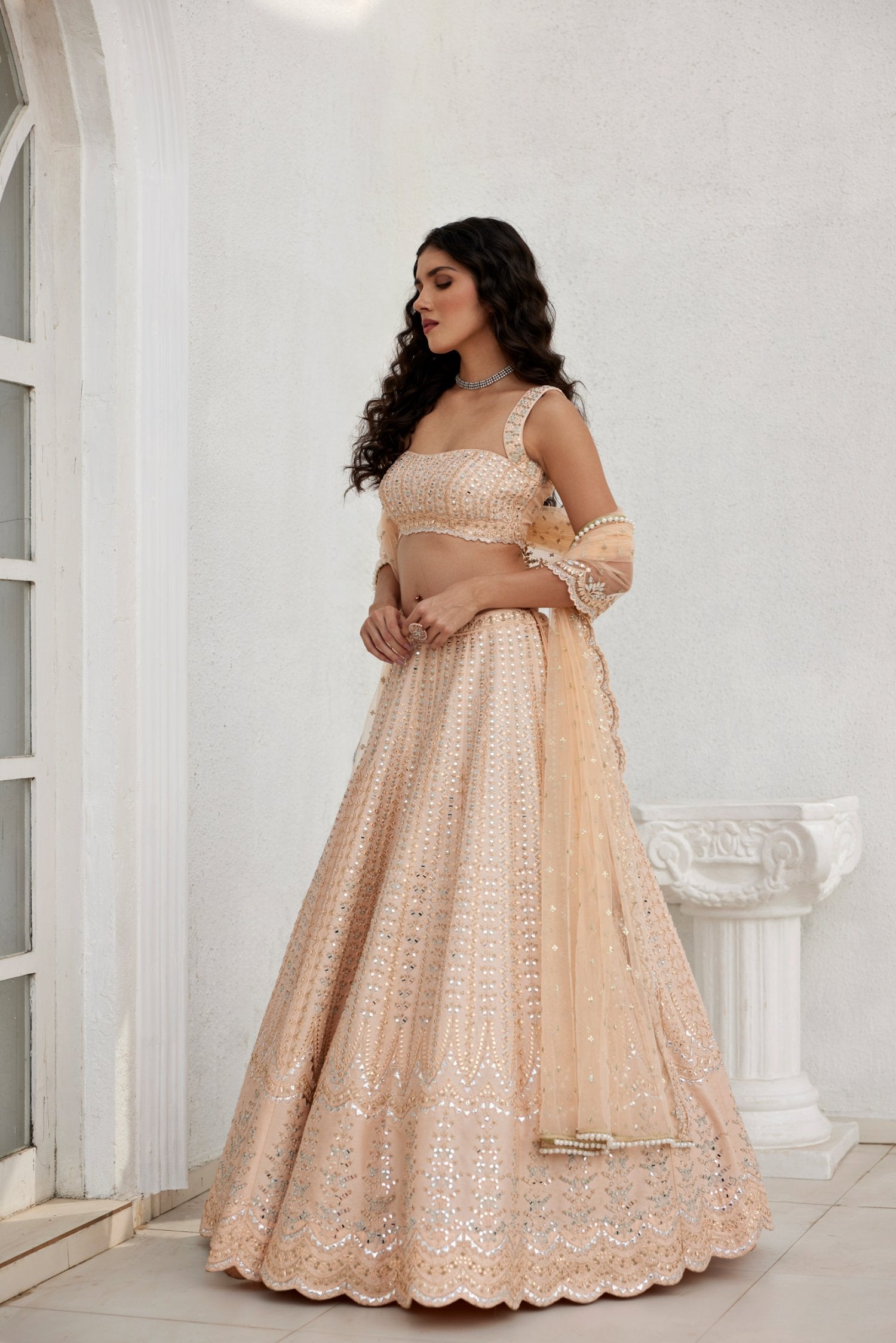 Dusty Peach Mirror And Leather Applique Skirt On Dupion Silk Paired With Embroidered Top And Tulle Dupatta.