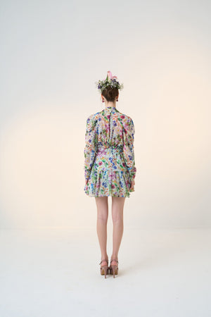 Mint green base, multi colored floral print skirt with elastic Waistline, gathered detailings& cotton lining.