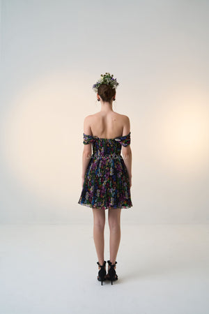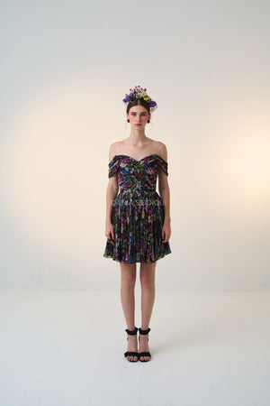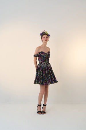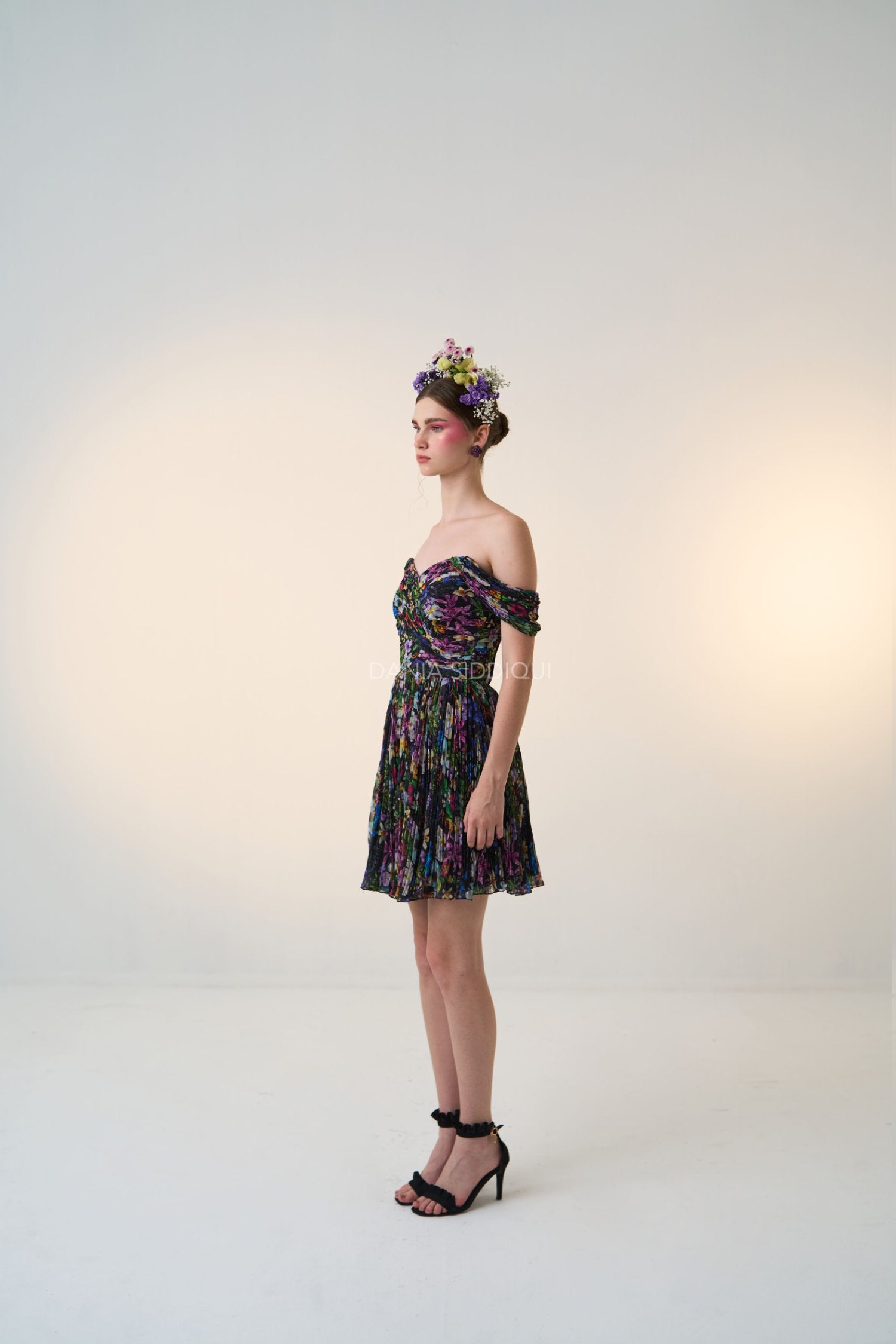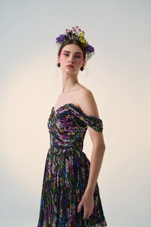 off-shoulder, ruched bodice, Corset, pleated fabric, satin lining, back zip & hook for closure.