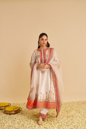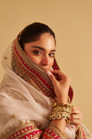 Finished with luxurious Banarasi fabric accents and delicate kiran trim, the Chauga captures the essence of traditional grandeur. It is paired with a classic salwar for comfort and tradition, and a sheer silk organza dupatta that adds a soft, ethereal touch to the ensemble.