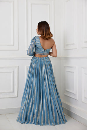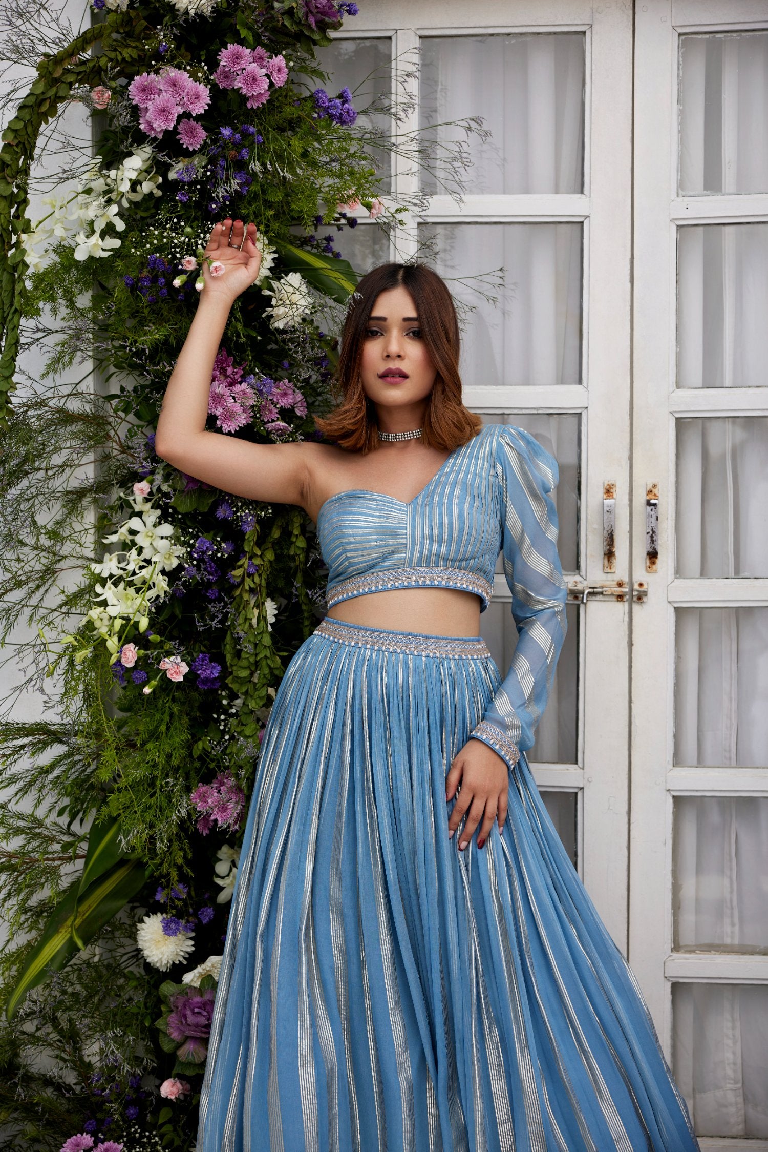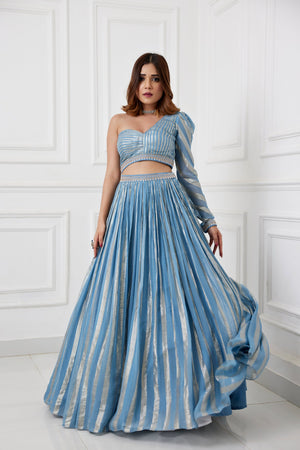 Blue Georgette Flared Skirt Paired With One Shoulder Full Sleeve Ruched Top Having Cutdana And Pearl Minimal Embroidery Detailing