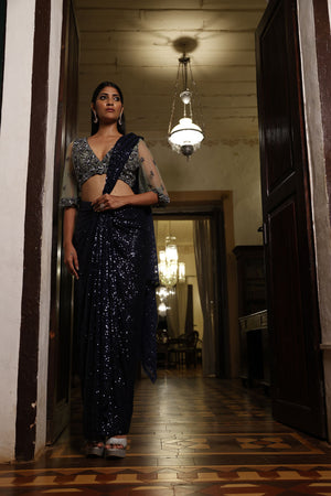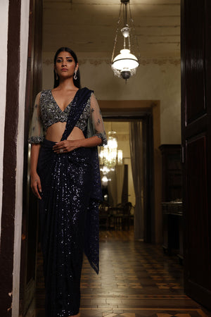 Saree: Navy blue stretch net all over embroidered sequins drape skirt with shiny blue stretch lining and navy blue stretch net stripe embroidered sequins drape attached from waist belt of the skirt | Choli: Sage net Ileana choli with cutwork bail on the neckline, bask and sleeve hem, floral all over work on the yoke and buttis all over the sleeves of Navy blue, gunmetal, white and silver work of cutdana, sequins, crystal, bead and pearl, crystal tassels on the tie-up at the back.