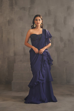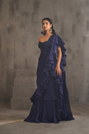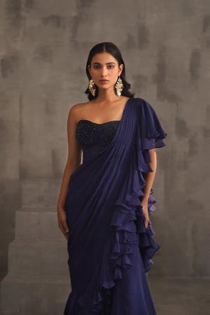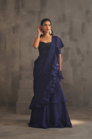 Deepika Chadha's stunning Navy blue Organza corset beautifully adorned with intricate sequins, cutdana, stones and crystal embroidery . The georgette and organza ruffle stitched saree is perfect for wedding and festive season.