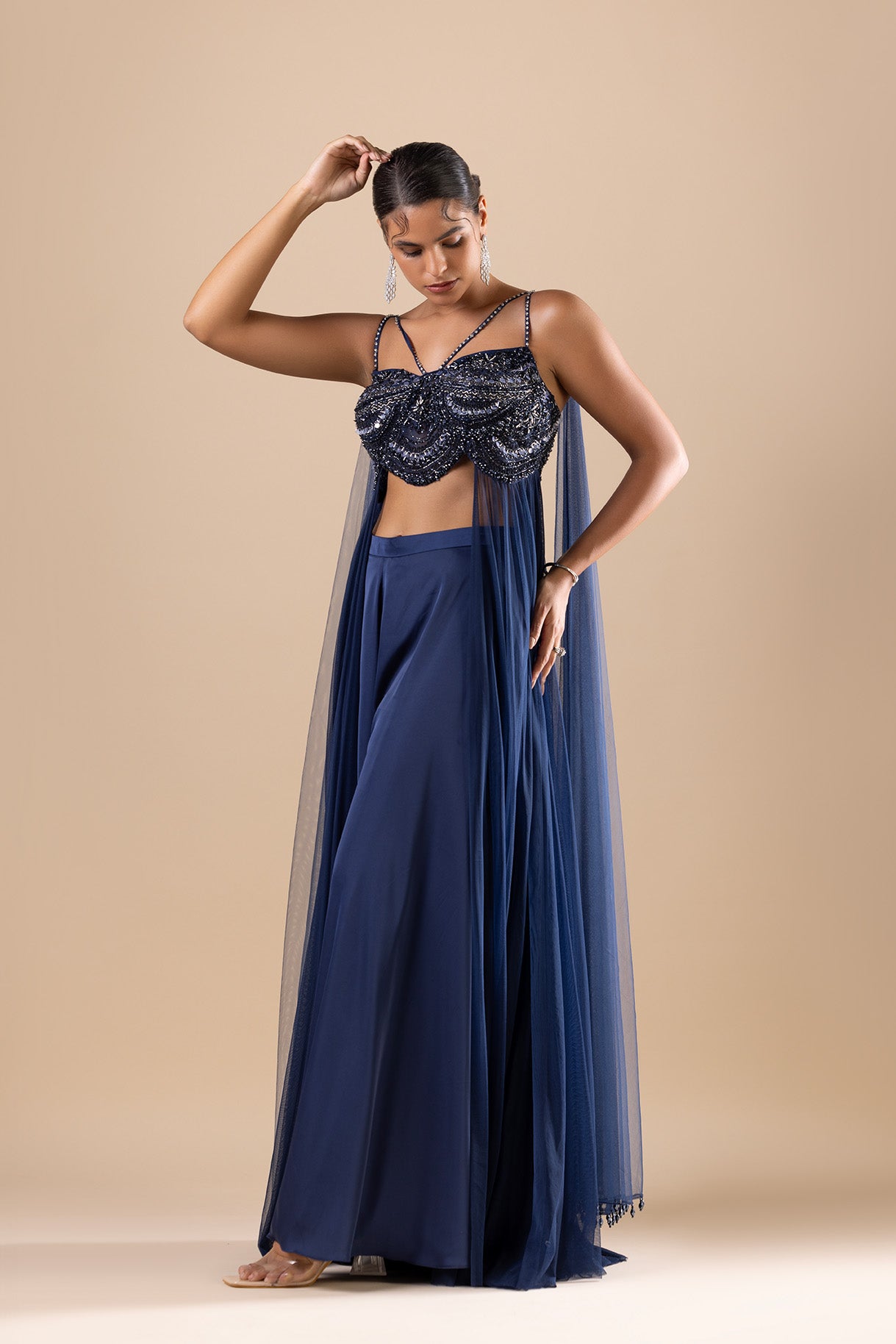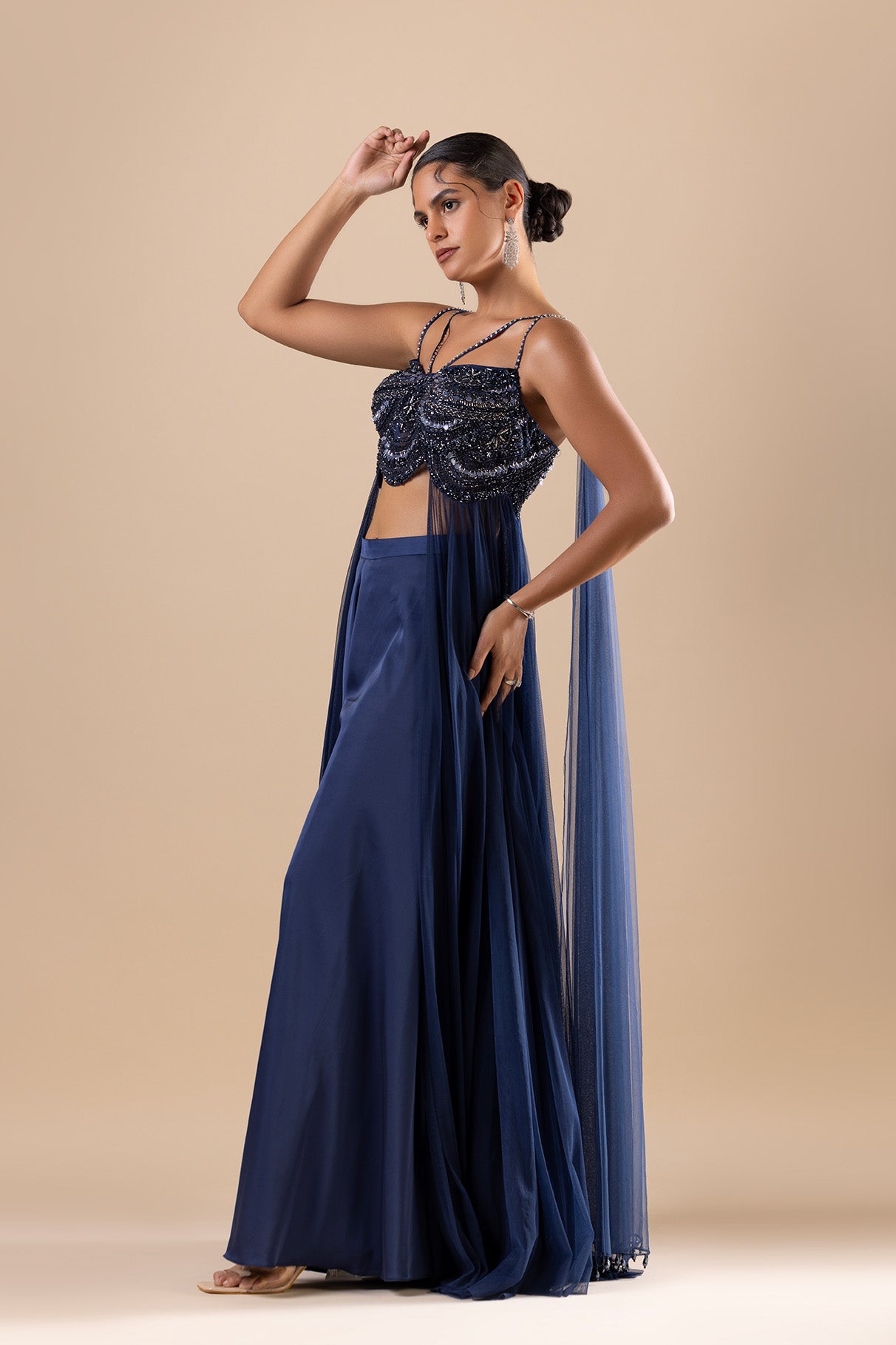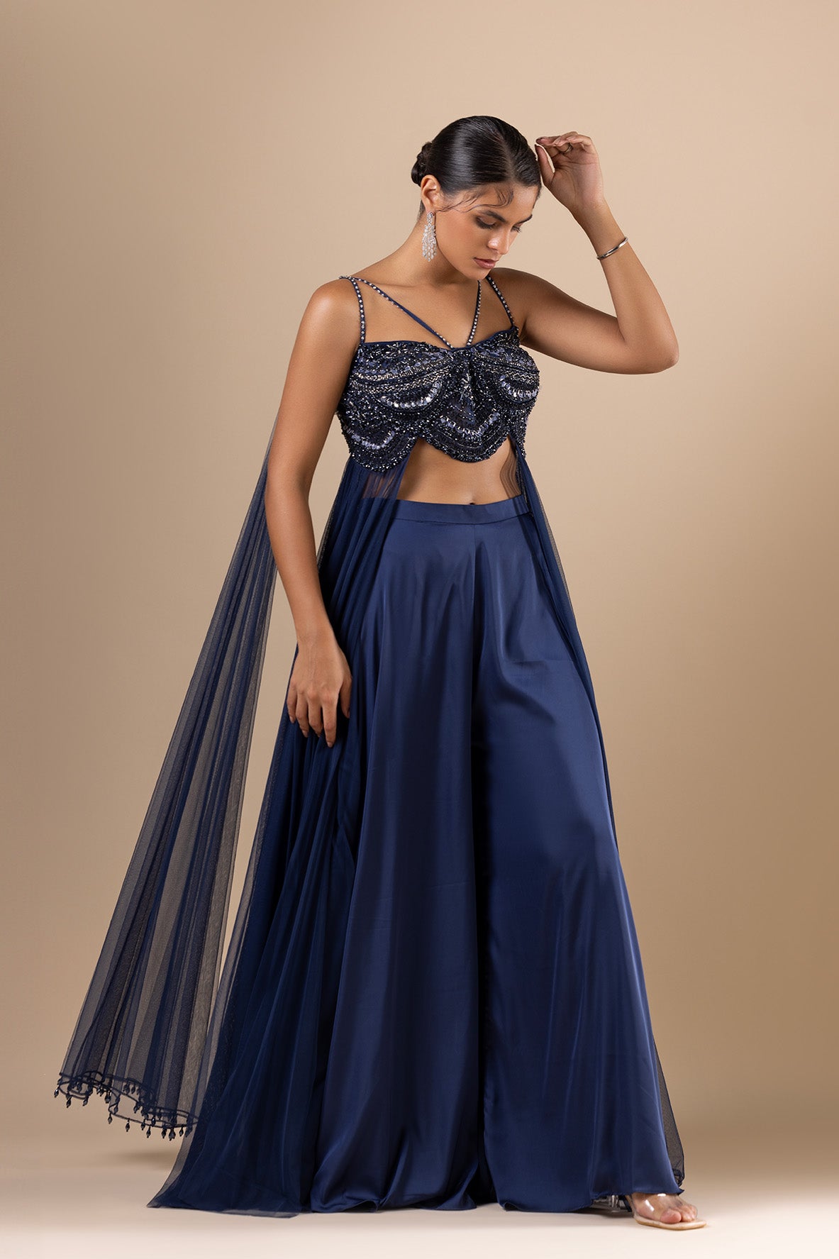 Navy Blue in Armani satin and soft net crop top with embroidered crystal, cutdana, sequins and swarovski detail. Paired with matching palazzo