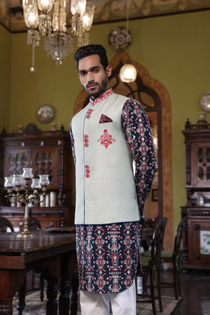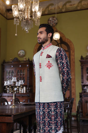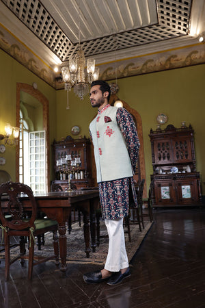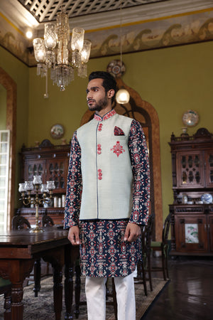 Navy Blue Kurta with Sage Embroidered Bandi and Pant