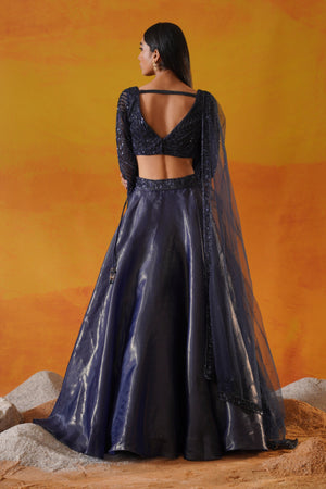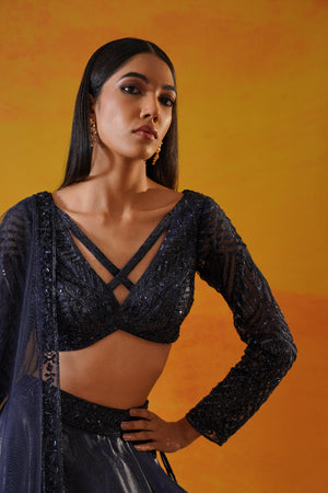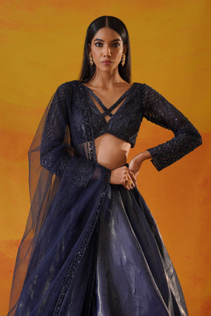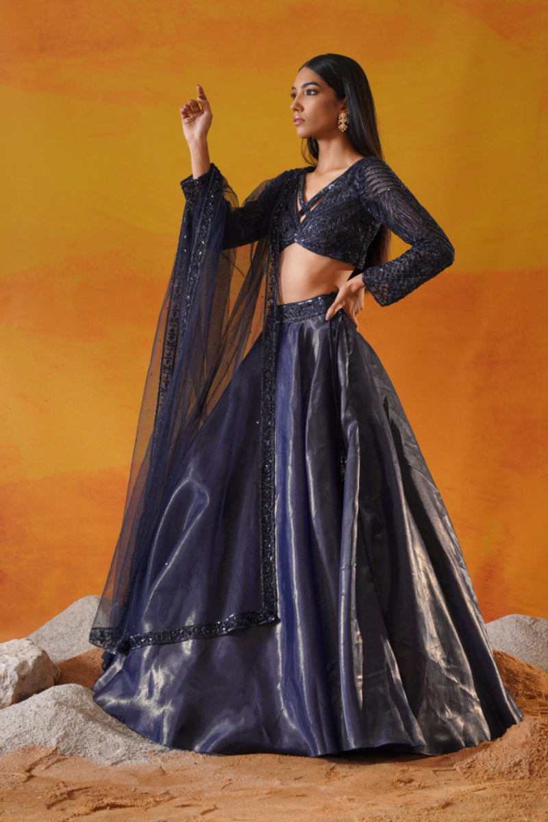 Kapda Dori's stunning navy blue shimmer tissue lehenga, beautifully adorned with intricate sequins and cutdana work on belt. The navy blue color adds a touch of glamour and sophistication to your look, while the soft fabric ensures you feel comfortable all day or night long. It is styled with a beige tissue blouse hand embroidered with cutdana, crystals and sequins. Pair it with complimenting navy blue net embroidered dupatta.