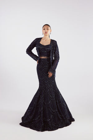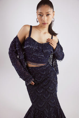 Navy net fish cut lehenga with a bustier, a jacket embroidered with tassels and an optional dupatta as well