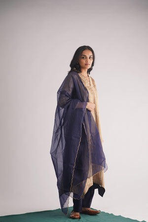 Navy Organza Dupatta With Gold Zari Scallop Edging