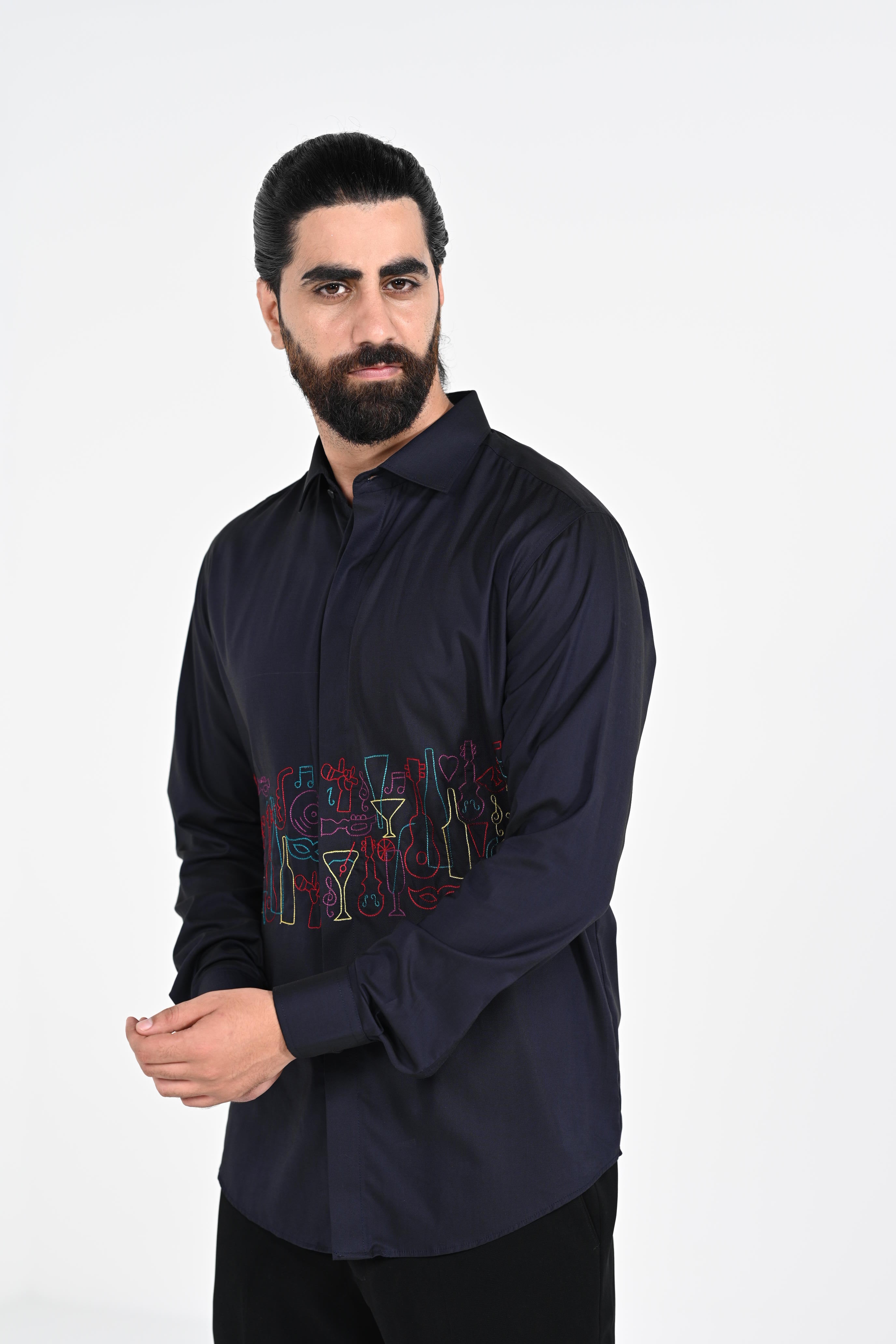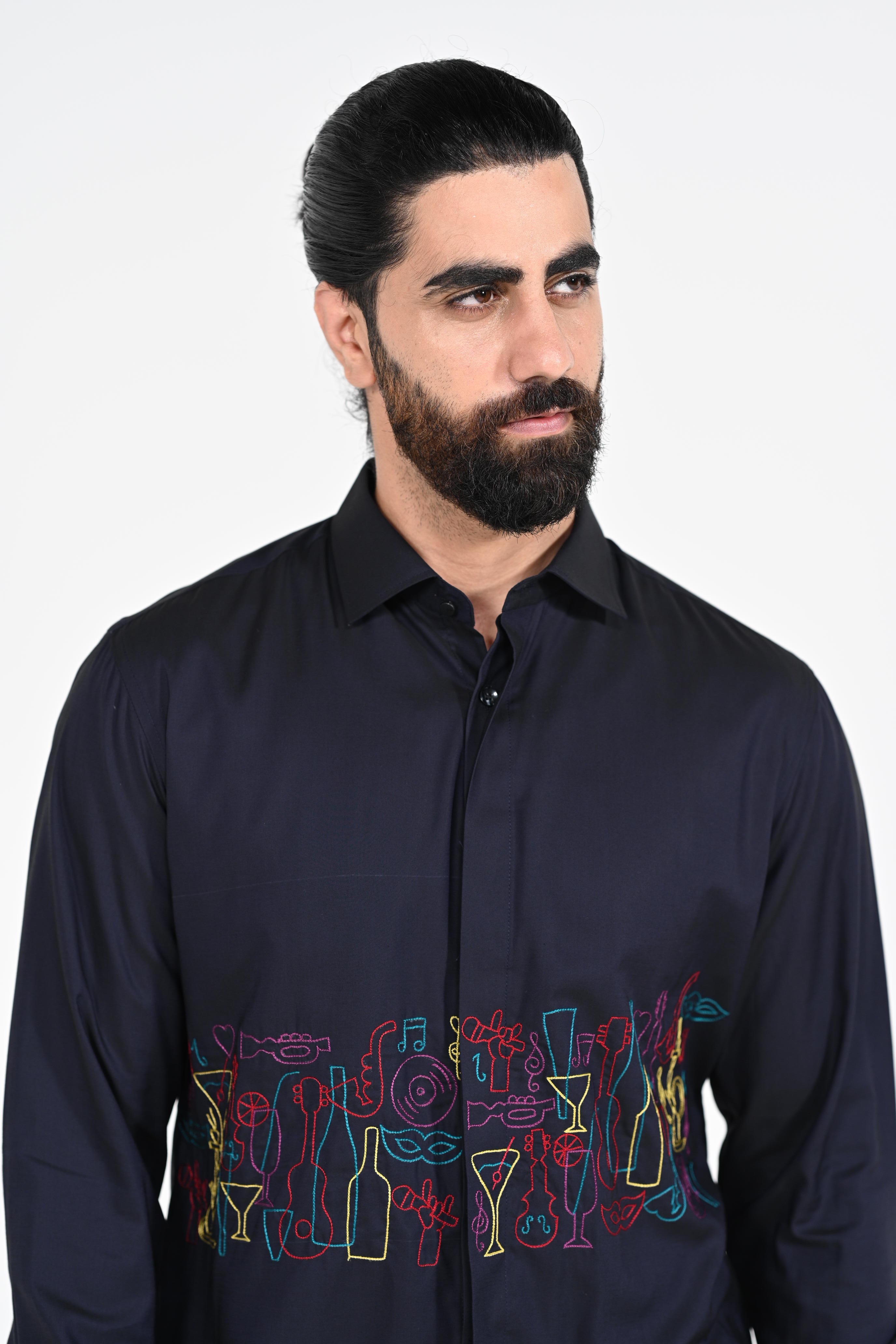 Featuring a Navy blue shirt with multie colour thread work on cotton strech base fabric .This contains only one piece. Color of the actual garment may vary due to lighting conditions during the shoot .