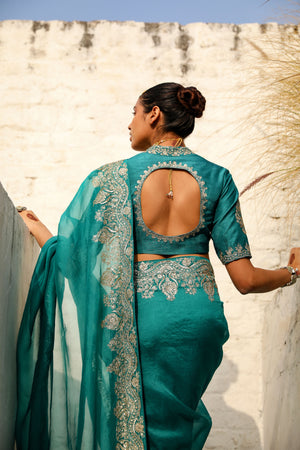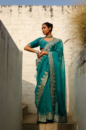 Make a lasting impression at your next event with our Nawazish Saree – a symbol of elegance, tradition, and the timeless beauty of Indian attire. Crafted from premium-quality organza, this saree features intricate zari and sequin embroidery by our skilled artisans that adds a touch of opulence to its rich teal green hue.