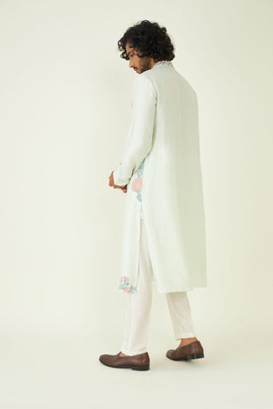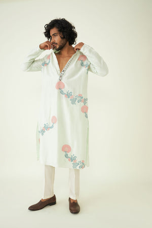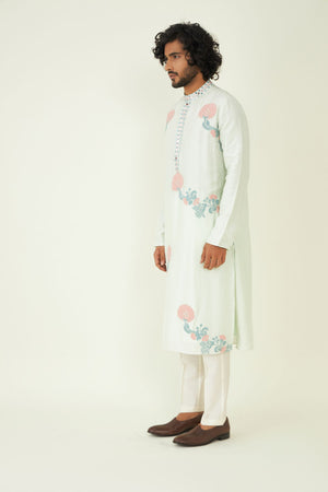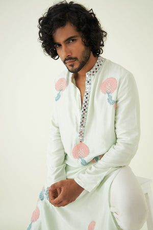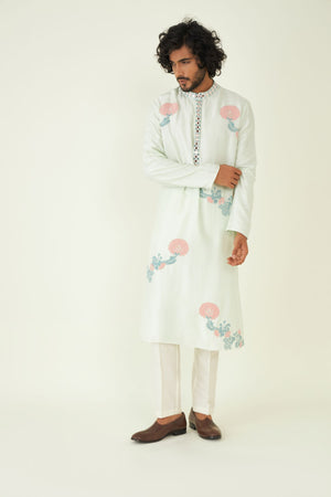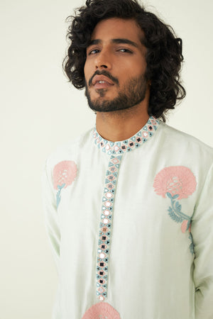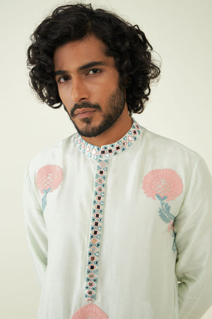 The kurta is adorned with intricate mirror work that reflects the rich heritage of Indian textiles and craftsmanship. These mirrors add a touch of opulence and uniqueness to the design.