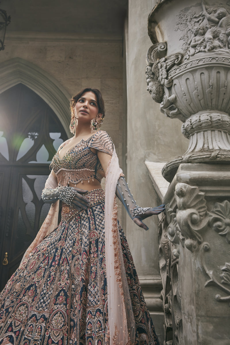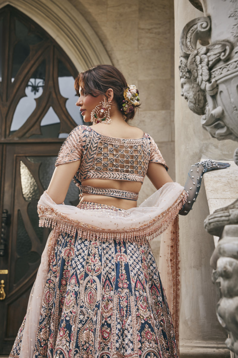A majestic creation in French Blue, this velvet lehenga set is adorned with blush pink appliqué