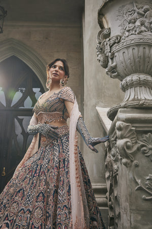 and intricate hand embroidery. Regal motifs grace the lehenga, including a striking depiction of