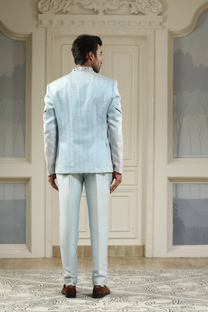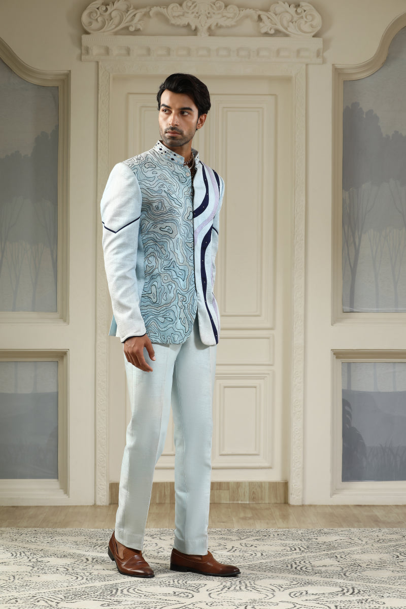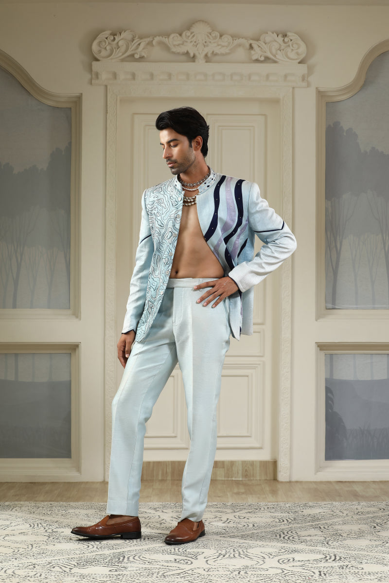 Tailored in a striking blue silk, this bandhgala set is paired with matching silk pants for a tonal, elevated look. The design features bold appliqué work in two shades—light and dark blue—creating depth and dimension. One panel is fully hand-embroidered in zari, resham, and intricate embellishments, making it a perfect choice for grand occasions with a modern royal touch.