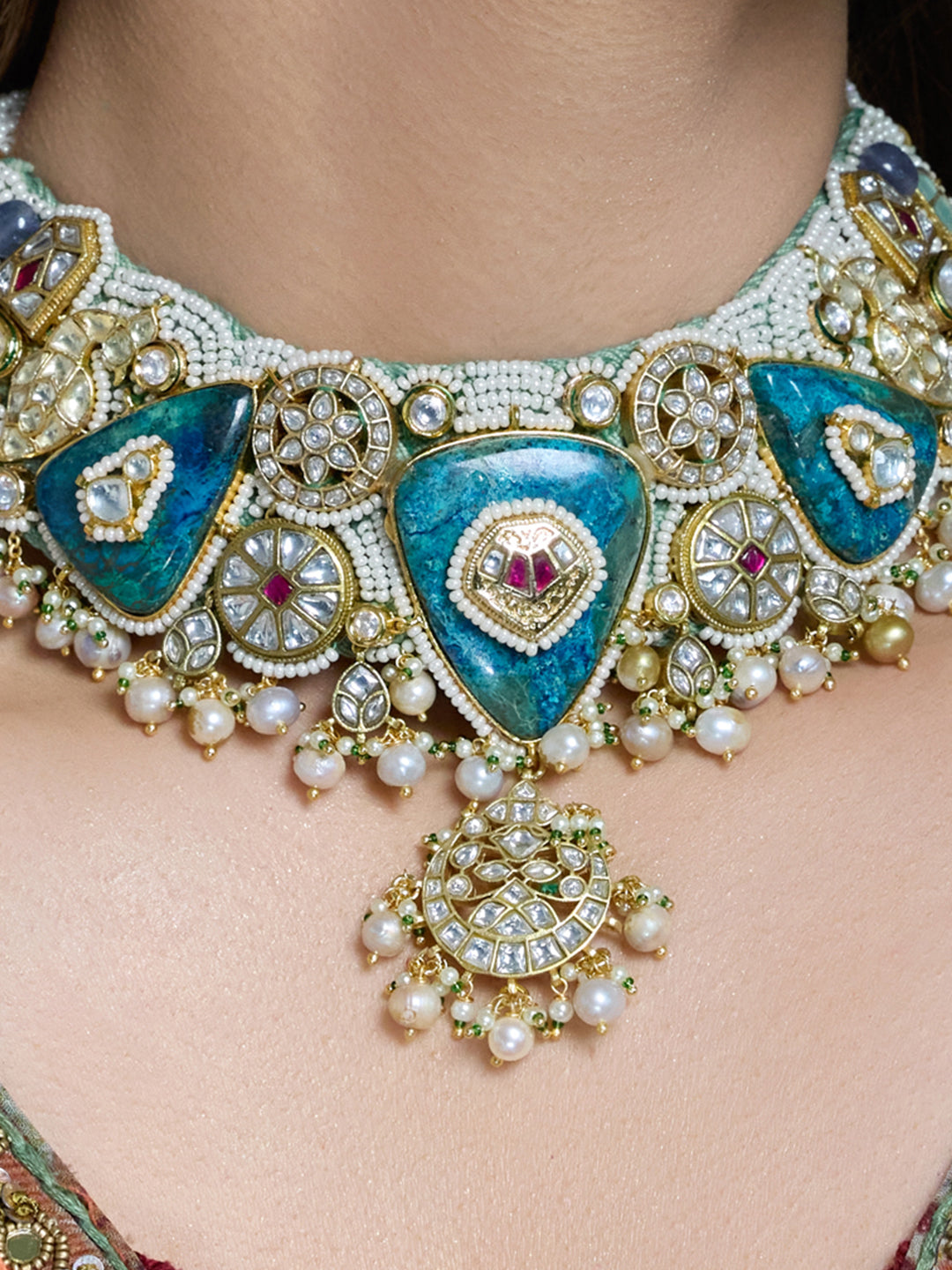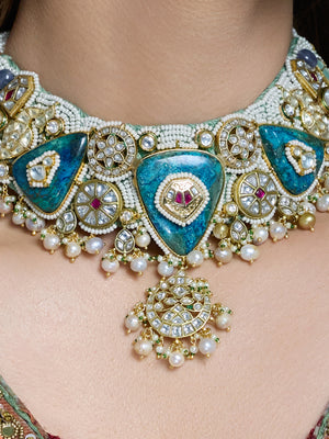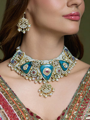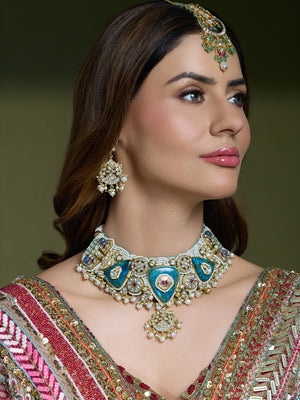 Infused with royal enamel work and intricate detailing, this bold necklace set in teal and gold tones captures the essence of royal heritage, crafted to elevate your grandeur at every celebration. Add matching earrings & accessories to complete the look.