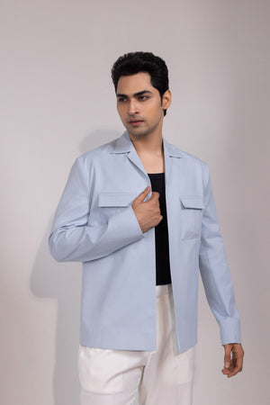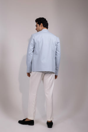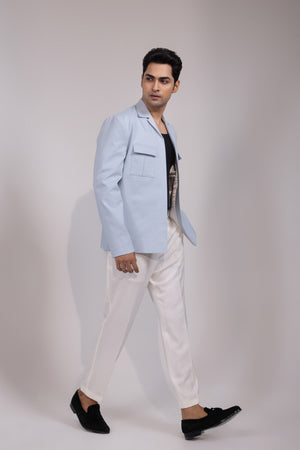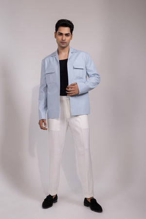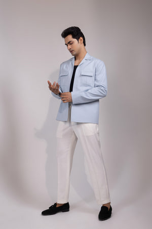 The jacket has a structured collar and two prominent chest pockets with flaps. The outfit is completed with a pair of white trousers.The overall look is modern and casual, with a sharp color contrast between the light blue jacket.