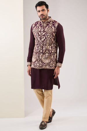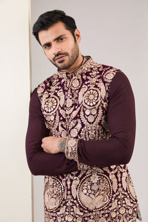 Ox Blood Georgette Full Embo. Metel Thread + Kasab Work Bund