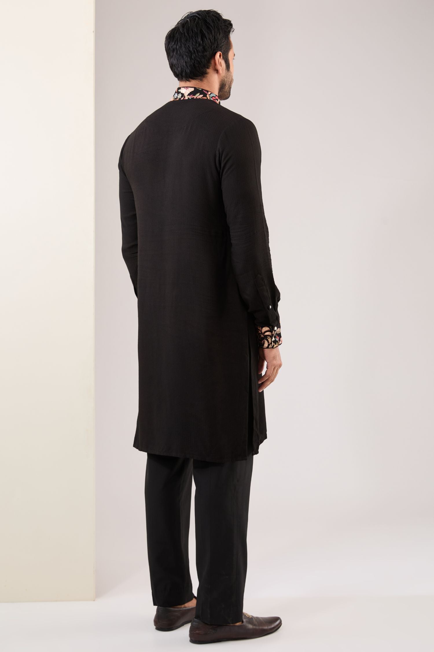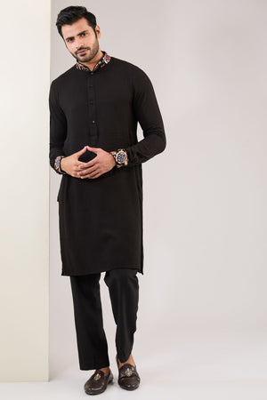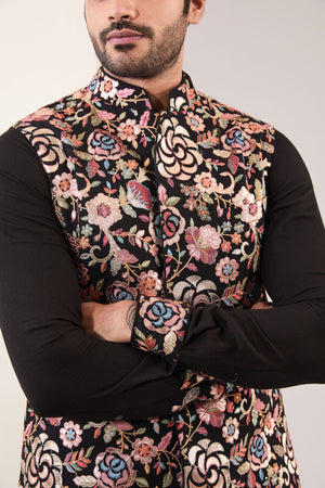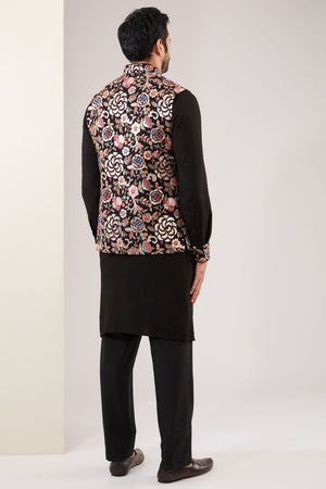 Black Full Multi Thread+ Metal Embo. Silk Bundi W Matching Cotton Silk Kurta W Embo. Cuff, Collar And Embo. Detailing On Inside Slits W Matching Pant