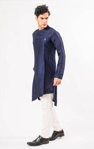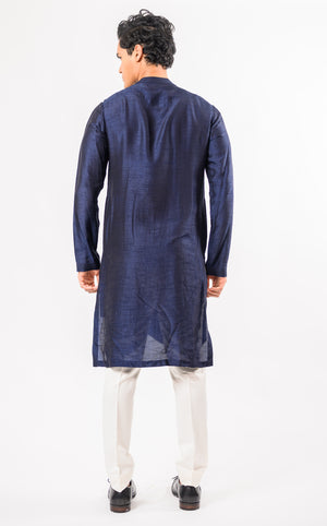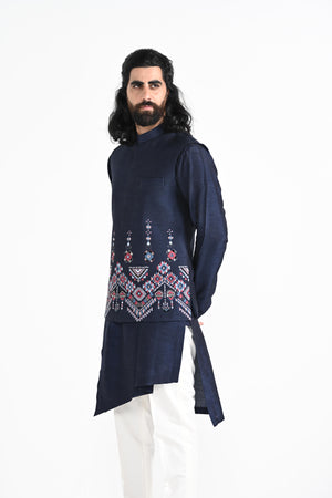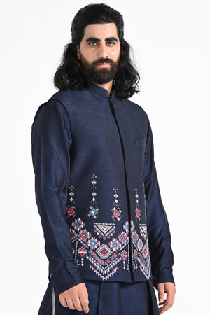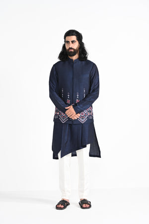 Navy Phulkari inspired Nehru Jacket with pipe, cutdaana and thread work embroidery with overlapping kurta highlighted with embroidery detail on the chest and stitchline border made in Bamberg Raw Silk. Paired with Ivory slim fit Pant Pajama. Color of the actual garment may vary due to lighting conditions during the shoot .