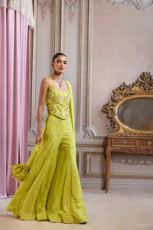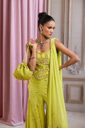 Neon green corset sharara featuring 3D floral applique, sequins, beads and mirror hand work on the corset, paired with flared sharara embroidered pants, a matching embellished dupatta with border on all corners and long statement tassels at the palla to add more drama.