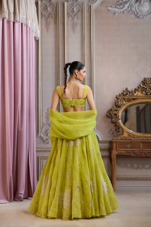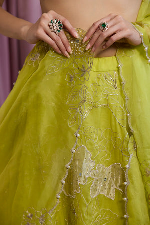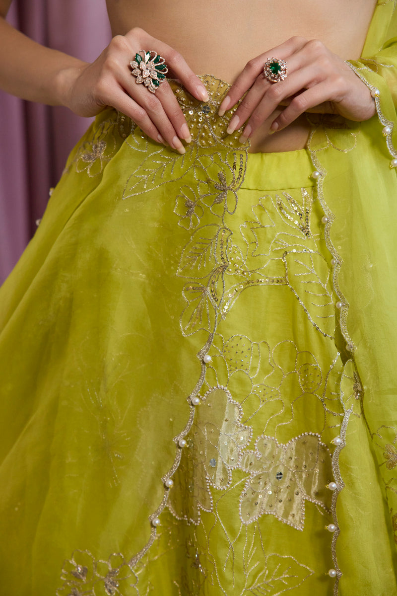 Neon green organza lehenga featuring highlighted floral patch work, pearls, aari work, zari ,sequins on the lehenga paired with floral embroidery bustier with cut-work detailing at the waist. It is paired with a matching organza dupatta with beautiful floral cut-work.