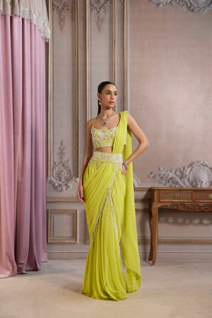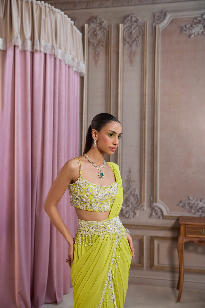 Neon Green Pre-Draped Saree With Bustier And Embroidered Belt