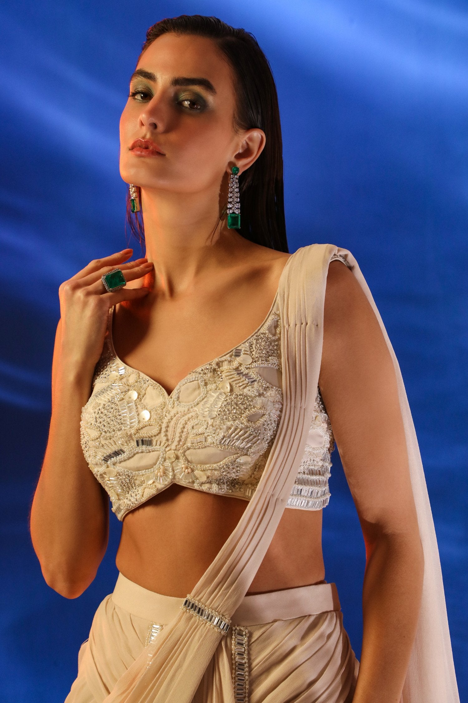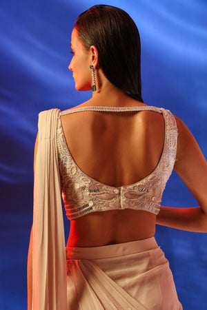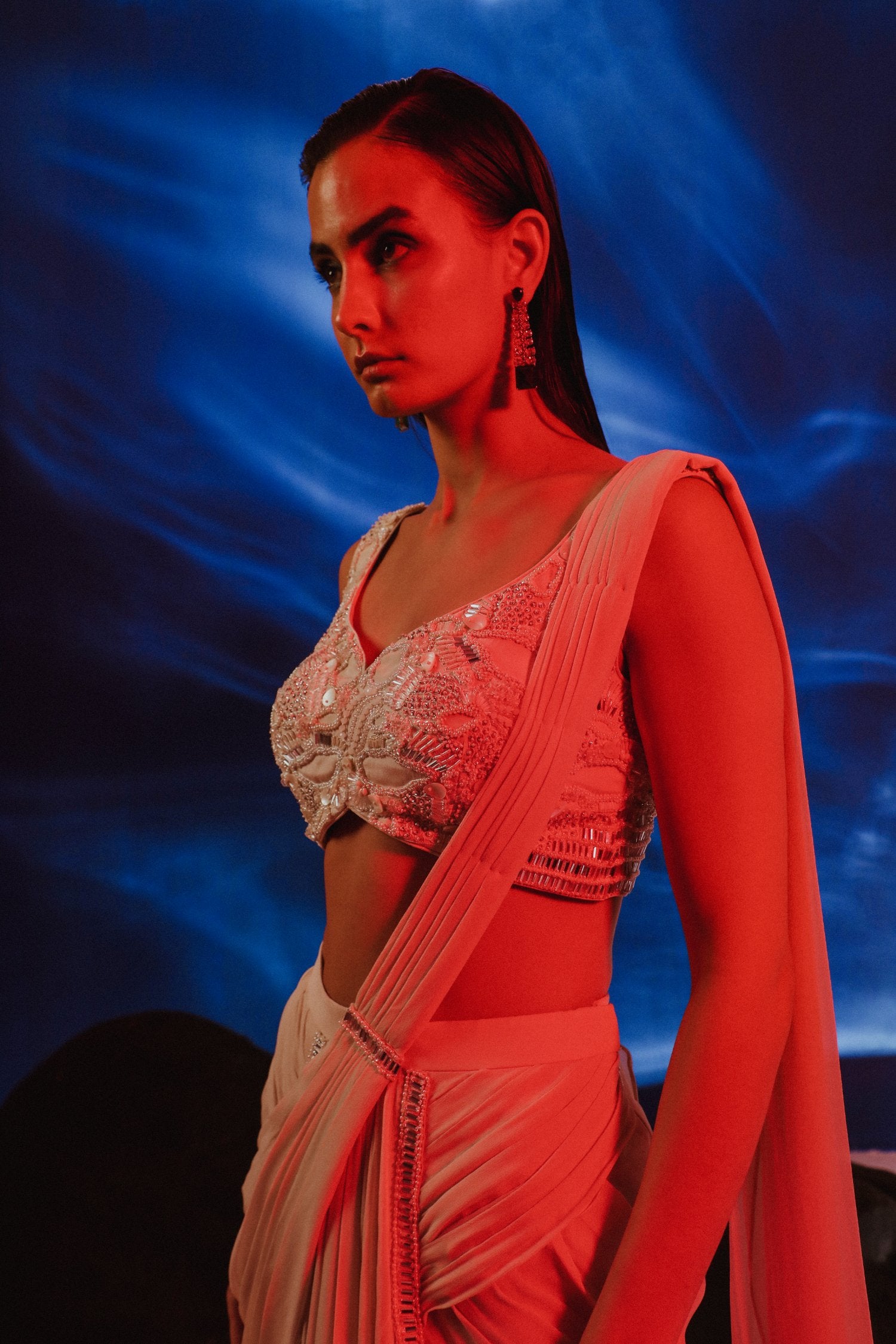 The Nerida saree is a an all-time favourite ensemble. Inspired by the intricate elegance of the world unknown to us, it is designed and created in a muted peach hue, featuring a finely embroidered blouse that complements a uniquley draped saree. Pair it with minimal accesories and sleek hair to achieve a perfectly edgy look.