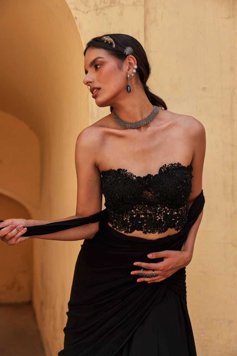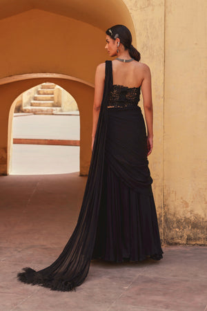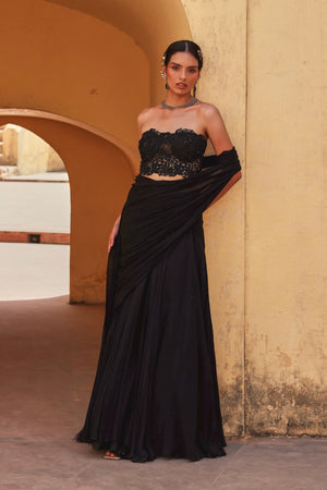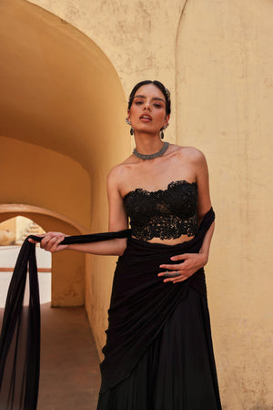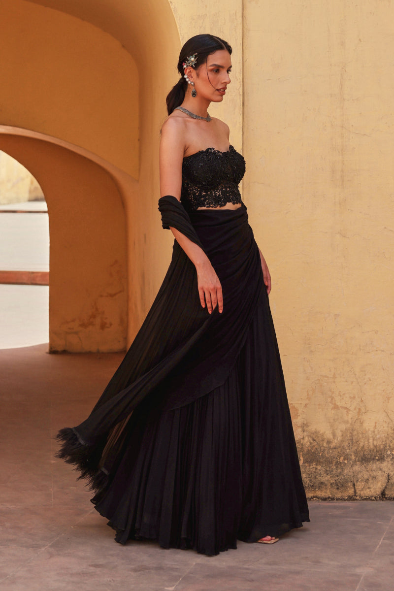 A striking all-black ensemble featuring a scallop-edged, embroidered corset bustier paired with a gracefully draped georgette drape skirt. The look excude timeless glamour with a touch of modern sensuality.