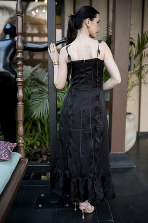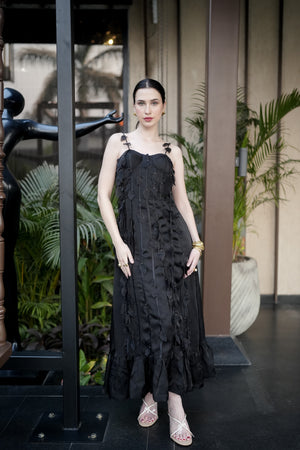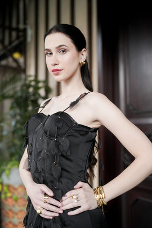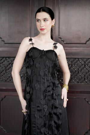 A black dress adorned with handmade organza petals and golden beads is super luxurious and elegant. The intricate details of the organza petals and golden beads add a touch of glamour and sophistication to the dress, making it a show-stopping piece for any special occasion. It's the perfect choice for those moments when you want to feel like a true fashion icon.