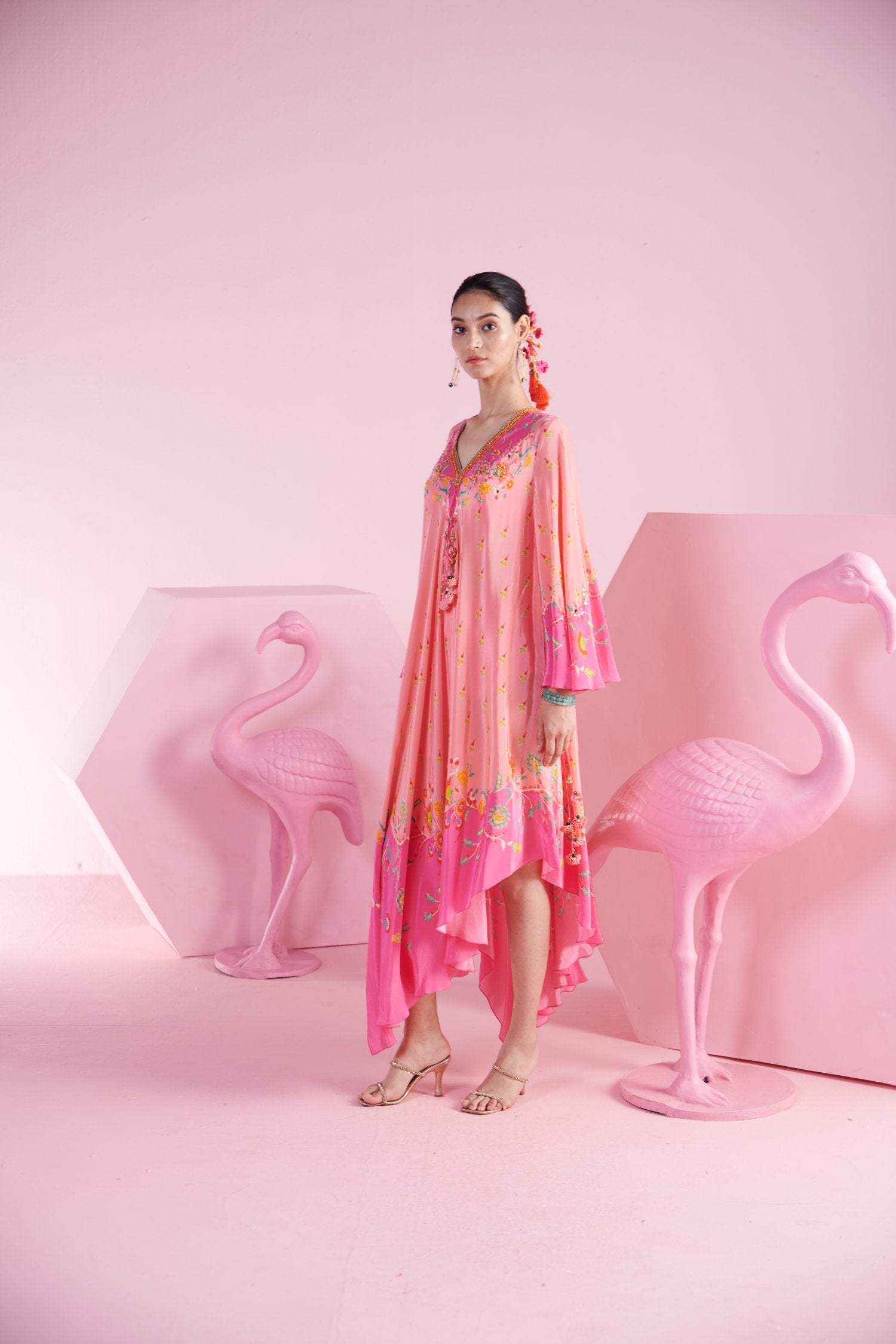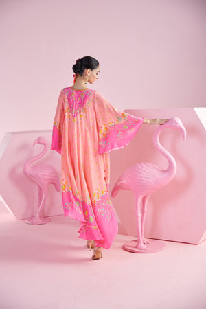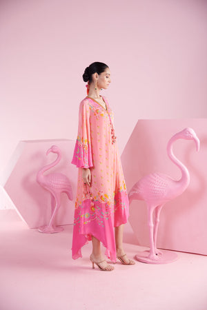 Embrace elegance and whimsy with the Pink Floral Asymmetrical Kaftan Dress. This enchanting dress features a vibrant floral print in soft pink hues, creating a fresh and feminine look. The asymmetrical hemline adds a contemporary twist, offering a unique and dynamic silhouette that moves gracefully along with embroidery around the neck and sleeves. Designed for comfort and style, this kaftan dress is perfect for any occasion, from casual outings to special events. With its flowy fabric and eye-catching print, this dress effortlessly blends traditional charm with modern flair.