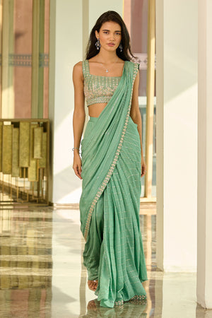 Green Georgette Sequence pre draped saree paired with zardozi, sequence and kundan embellished square neck blouse