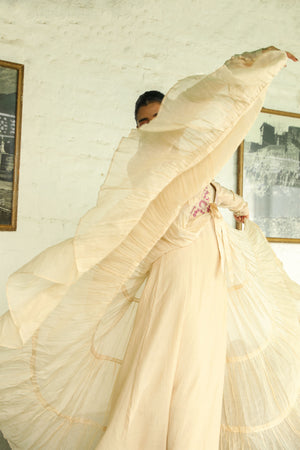 Niram Kurta Set is crafted in two piece layering. The jacket is adorned with resham and zari embroidery, showcasing the artistry and craftsmanship, and beneath the jacket is a tonal churidar anarkali kurta paired with tonal churidar pants. The ensemble is supremely versatile and can be styled in multiple ways. To add an extra touch of grace, you can carry the outfit with a tonal organza dupatta crafted with scalloped resham embroidery.