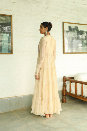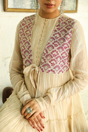 Beige embroidered jacket with tonal anarkali kurta and churidar pants topped with organza dupatta