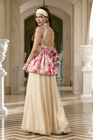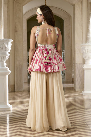 An ivory peplum top adorned with pink floral motifs, featuring a front hook closure, waist tie-up detailing, and intricate lace accents for a delicate finish. It is paired with flared, complementary palazzos, creating an effortlessly elegant and feminine ensemble.