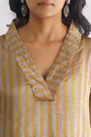 This two-piece set includes a kurta(with a slip) and pants. The kurta is made of beautiful handwoven chanderi tissue fabric and has a sophisticated stripe design in golden and silver grey. The stand collar is decorated with intricate sequins, beads, and navy threadwork, which adds to its elegance. The handkerchief-style hemline is skillfully finished with contrasting navy fabric on the inside, also seen on the sleeves that can be folded for a complete look. Comes with navy cotton silk pants and an organza dupatta with gold zari scallop edging.