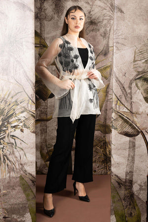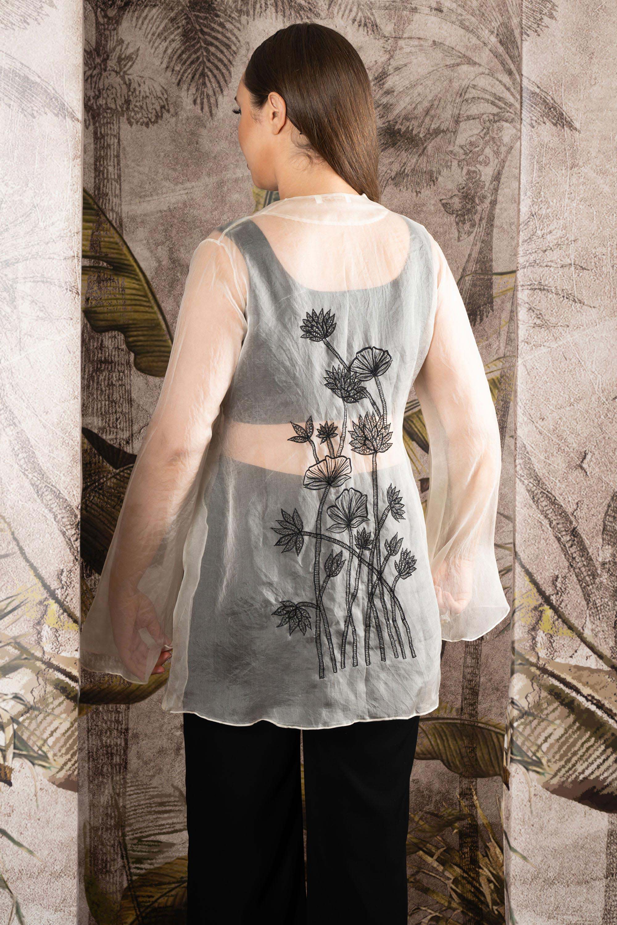 Imagine a stunning organza top with intricate machine embroidery, featuring a loose, flowy silhouette!