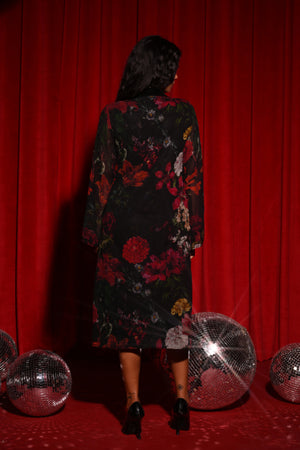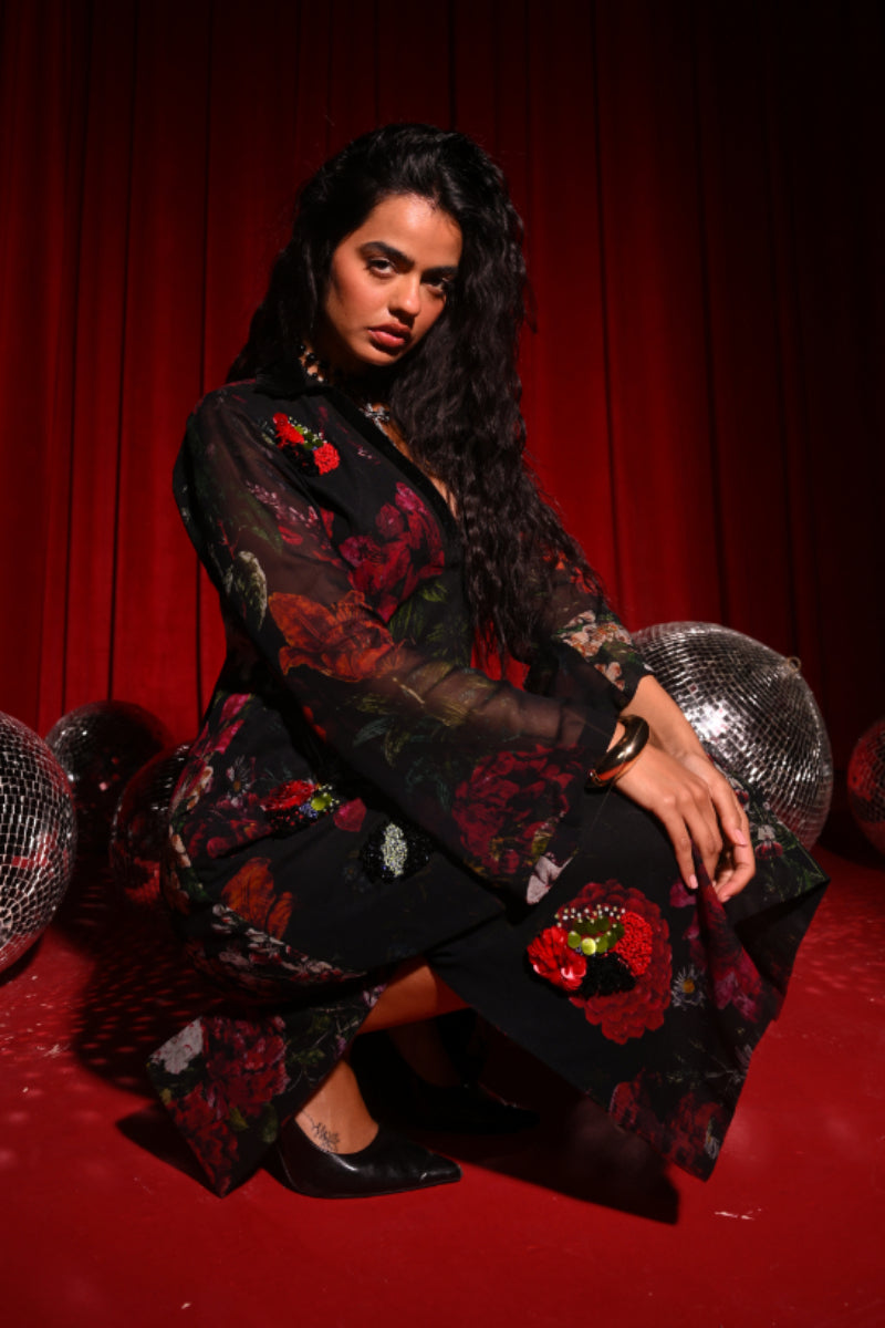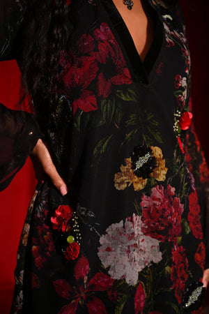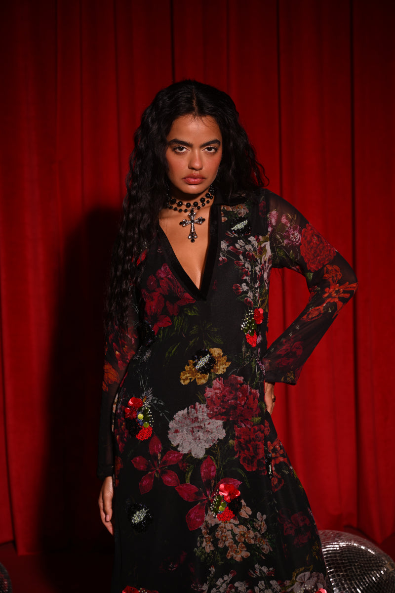 Mysterious, mesmerizing, and made for moonlit moments, the Nocturna Dress is where dark romance meets effortless sophistication. Crafted in luxurious georgette, this ethereal masterpiece drapes the body with a dreamlike fluidity, embodying timeless grace with a modern edge. The deep midnight black canvas is adorned with whimsical oversized florals, blooming in rich crimson, wine, and soft blush tones. Hand-embroidered floral accents featuring tonal beadwork and delicate sequin work add a touch of celestial shimmer to the overall look. The V-neckline enhanced with premium velvet detailing, elegantly elongates the frame, while the relaxed A-line silhouette flatters all body types. Billowy semi-sheer sleeves, with subtle embroidered details, bring an air of mystique and femininity, gracefully complementing the midi-length hem. The dress is finished with a delicate side slits adding just the right amount of sensuality and ease of movement.