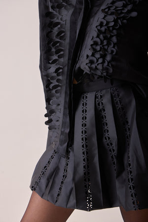 Crafted in lustrous taffeta and lined with soft mul, this skirt redefines evening ease with a youthful edge. Laser-cut detailing adds dimension and artistry, while its voluminous silhouette brings movement and modern charm. Style it with the matching fringe shirt for a bold statement, or pare it back with a simple tee for effortless allure.