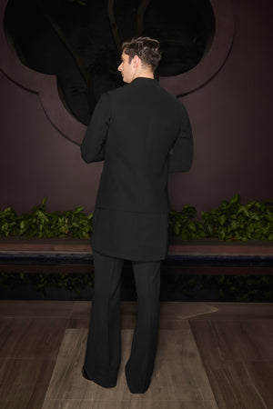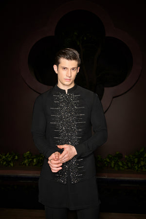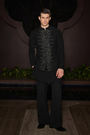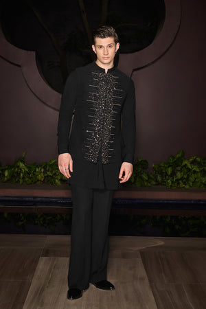 An all-black Nehru jacket beautifully embellished with shimmering crystals and stone work, paired with a classic kurta and pants