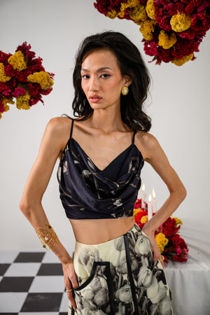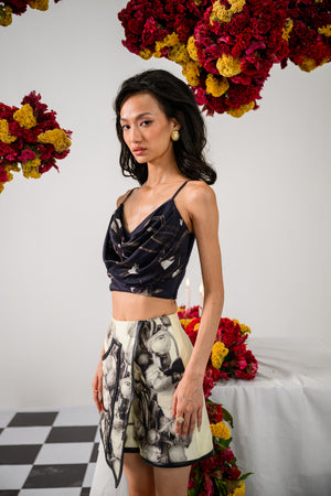 Drape yourself in midnight allure with the Noir and Ivory Cowl Bustier, where a deep V neckline meets luxurious cowl draping in a vintage black print. Sleek, adjustable straps adorned with golden accents bring a chic, bold edge to your look. Elevate the ensemble with a skort in off-white vintage print—combining the edginess of a skirt with the comfort of shorts. This asymmetrical skort features bold leather piping across the hem and around a striking front patch pocket, making it the perfect statement piece for a chic vacation or a glamorous night out.