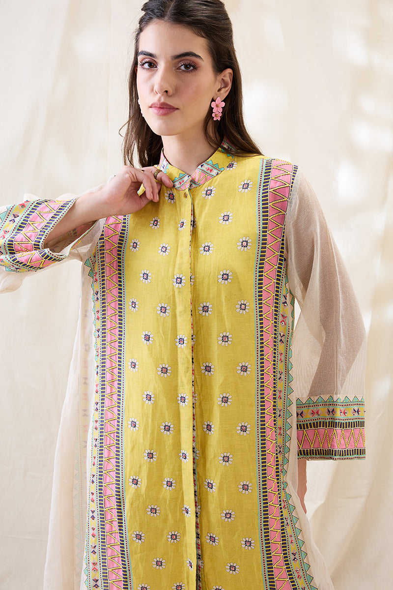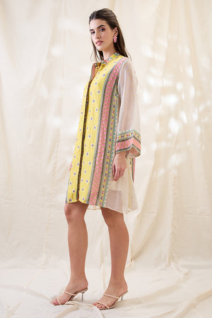 Yellow Nooma embellished A-line dress with flared sleeves in linen.