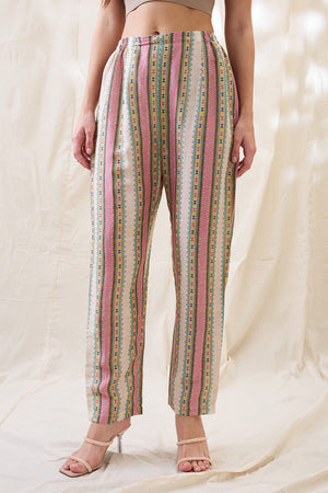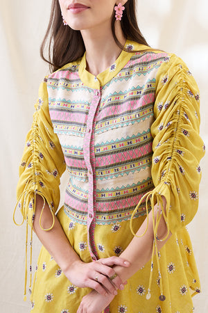 Yellow Nooma embellished handkerchief cut top with gathered sleeves, paired with straight pants in linen.