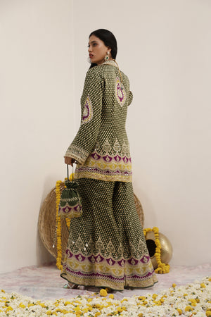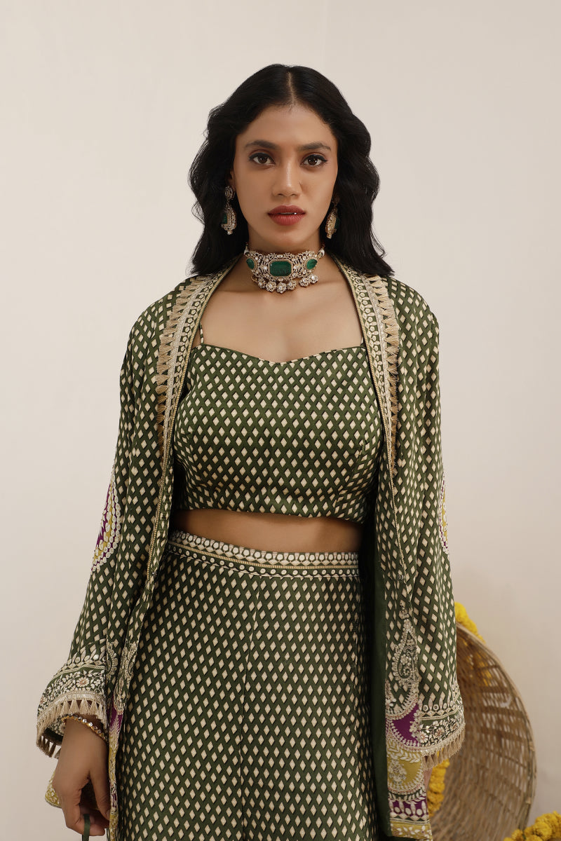 modern silhouettes. Featuring rich olive green hues and intricate printed detailing