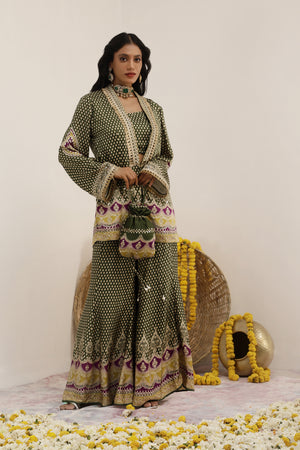 mustard color adds vibrancy to it. This set includes Blazer, Sharara and Blouse.