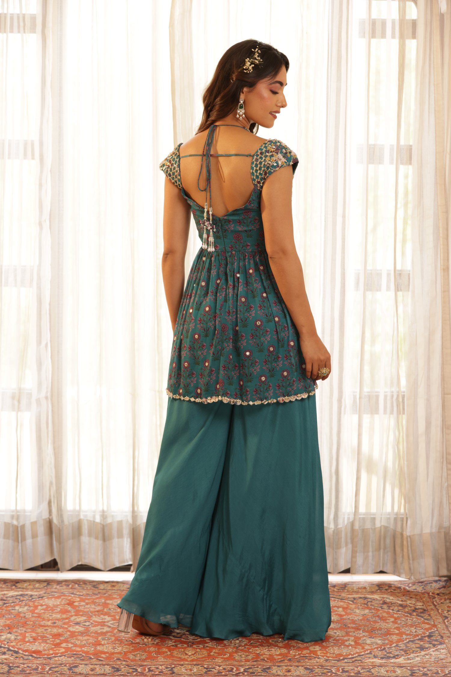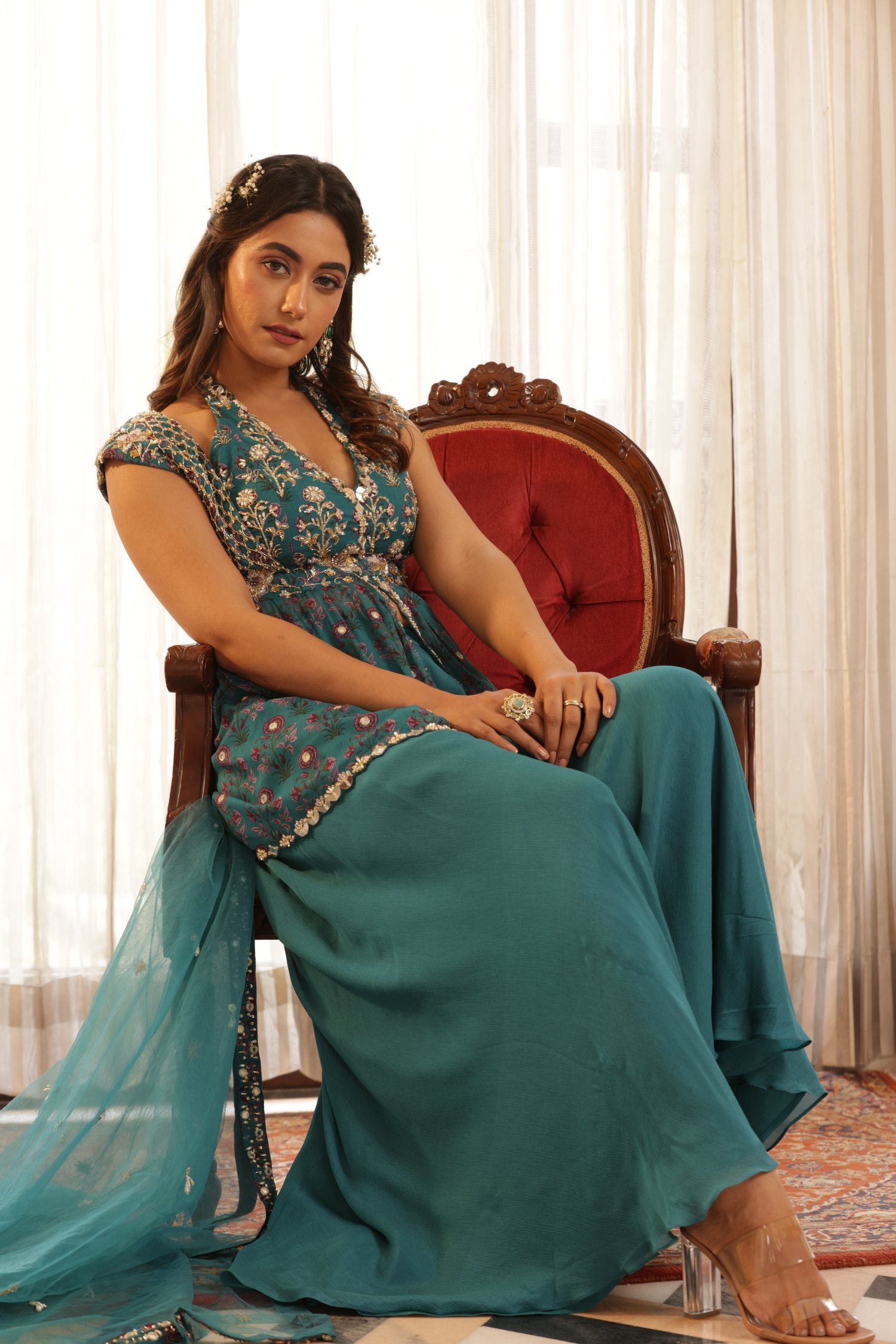 Double neck hand embroidered peplum, Paired with Flared pant and net dupatta