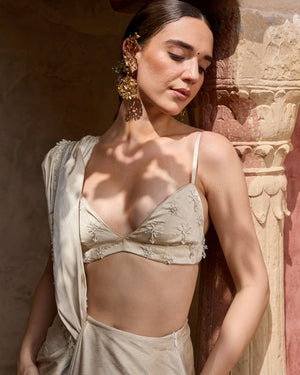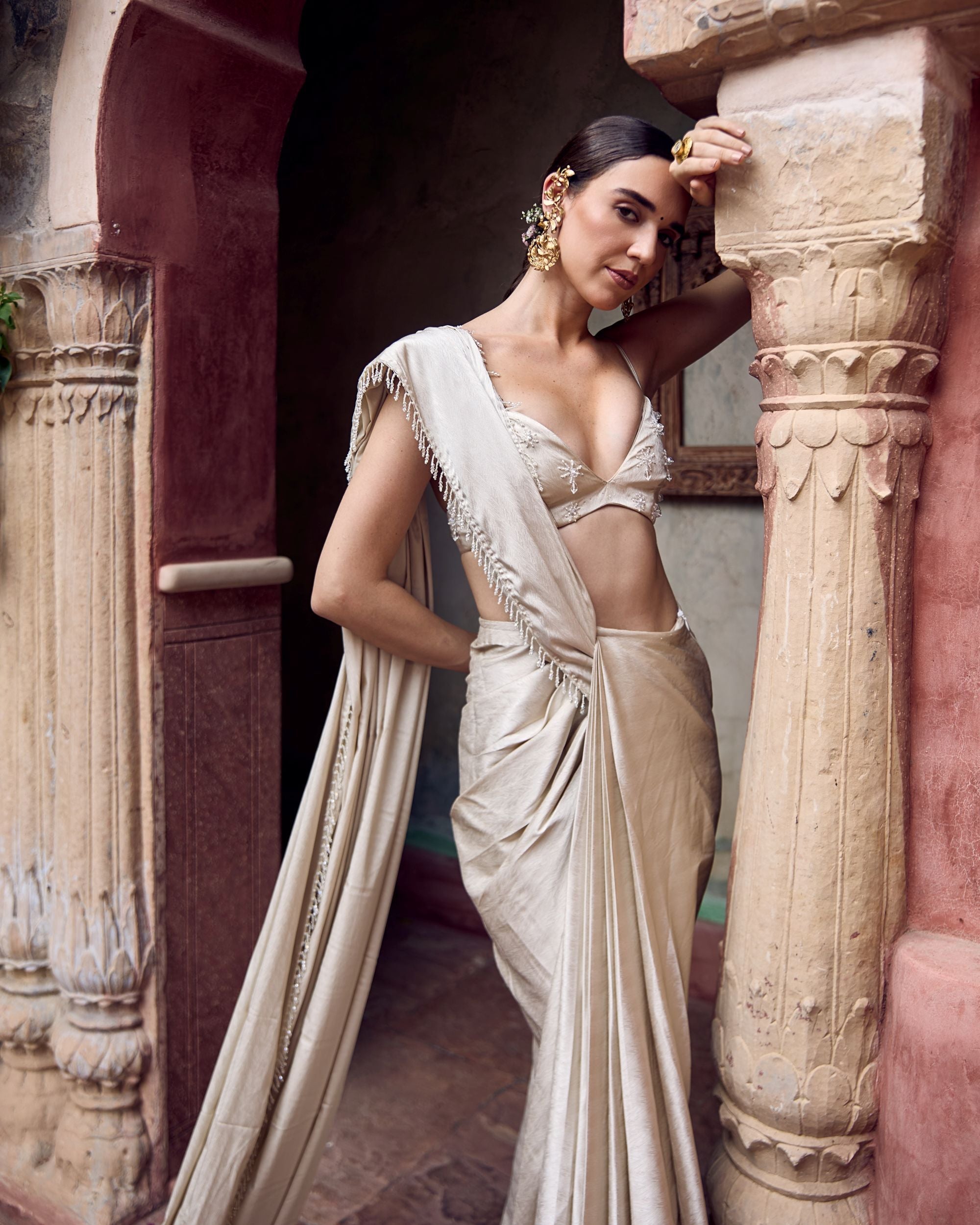The Noor Saree is a modern draped saree paired with a handcrafted blouse, adorned with delicate handwork and hanging tassels. Effortless and elegant, it’s designed to shine at weddings, cocktails, and festive evenings