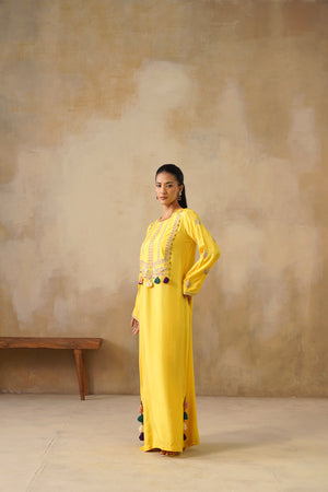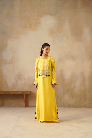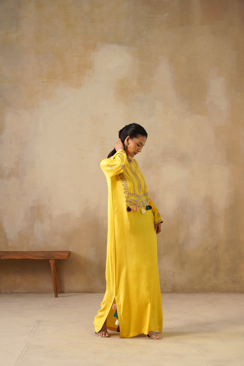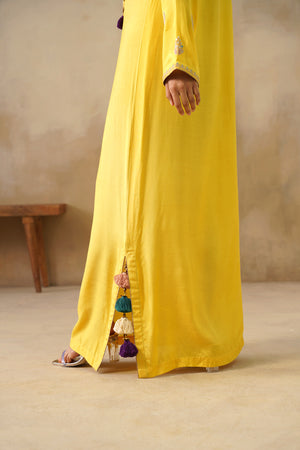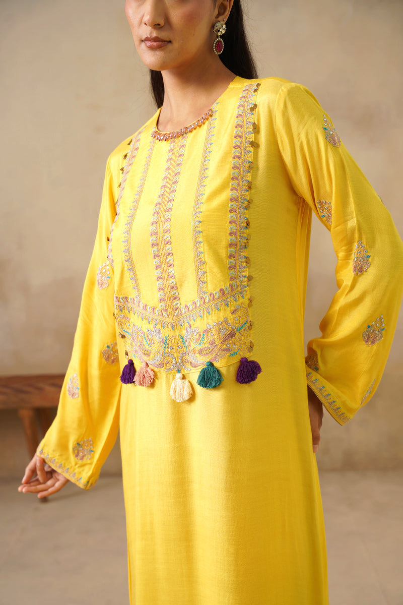 This straight cut dress has dori and thread embroidery on the neck and sleeves. Enhanced with pearls, tassels and ghungroo. It's an effortless outfit for any occasion.