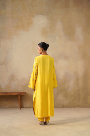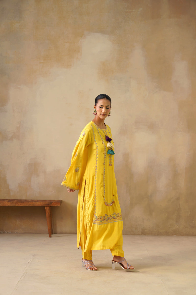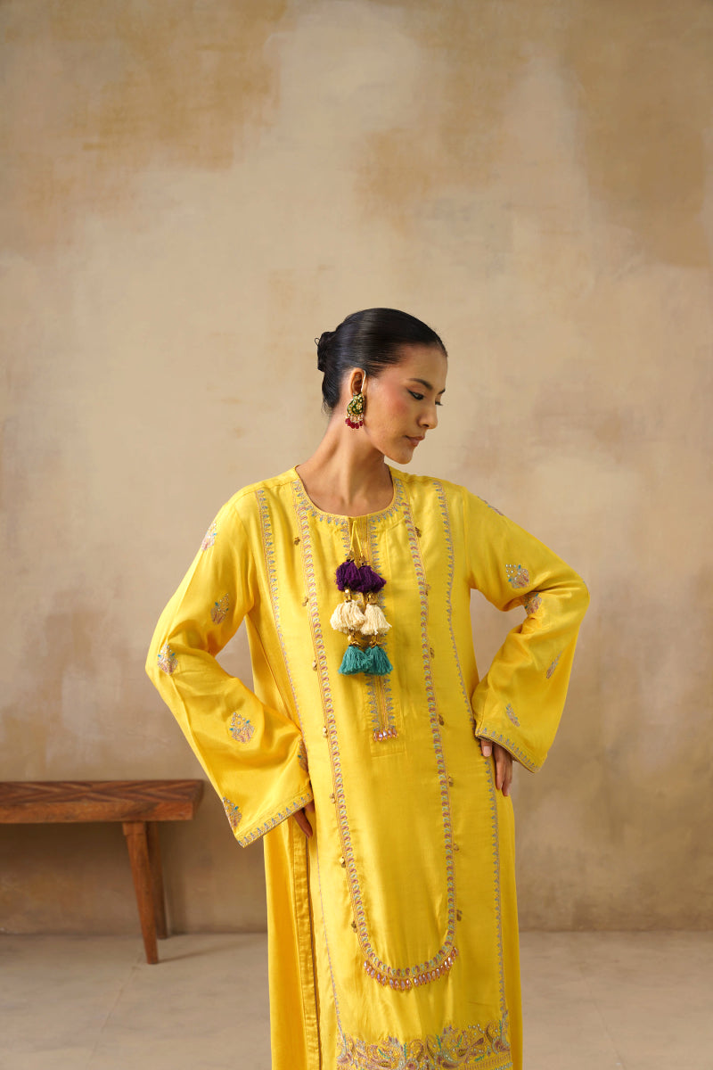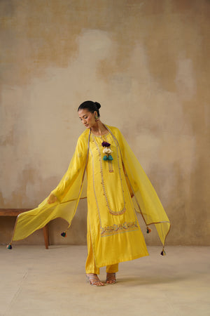 This side kali suit, paired with a salwar and dupatta, features embroidery on the back, sleeves and salwar, adding a dash of panache to the suit. The suit set is adorned by dori and thread embroidery with pearls, tassels and ghungroos.