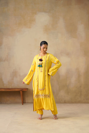 This straight cut suit has dori and thread embroidery on the neck, front and sleeves enhanced with pearls, ghungroos and tassels hangings on the neck and front.
